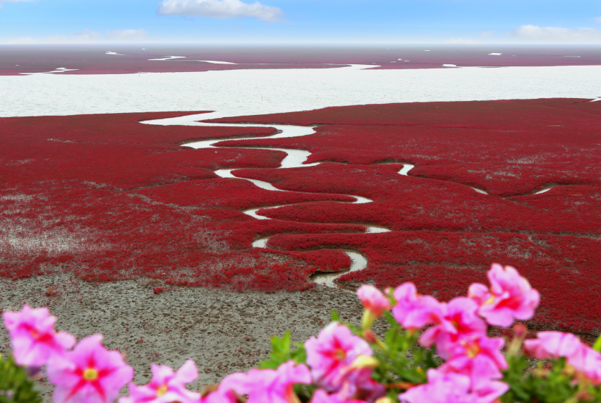 红海滩国家风景廊道座落于辽宁省盘锦红海滩湿地度假区,南起二界沟混江沟大桥,北至接官厅,全长约18公里,占地20平方公里。这里以举世罕见的红海滩为特色,以全球保存最完好、规模最大的湿地资源为依托,以世界最大的芦苇荡为背景,与数以万计的珍稀水禽和一望无际的浅海滩涂构成了一条生态风景廊道。